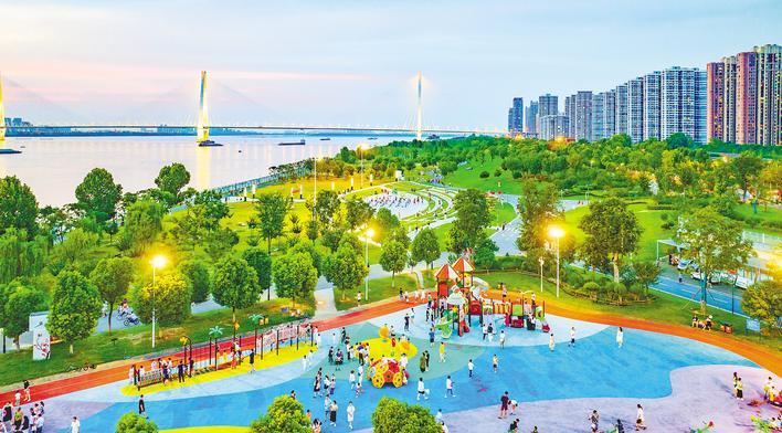 武汉武昌河滩公园绿化覆盖率较高,极大提升了城市的生态质量,吸引了众多市民来到江边休闲娱乐。 (湖北日报全媒体记者 薛婷 摄)